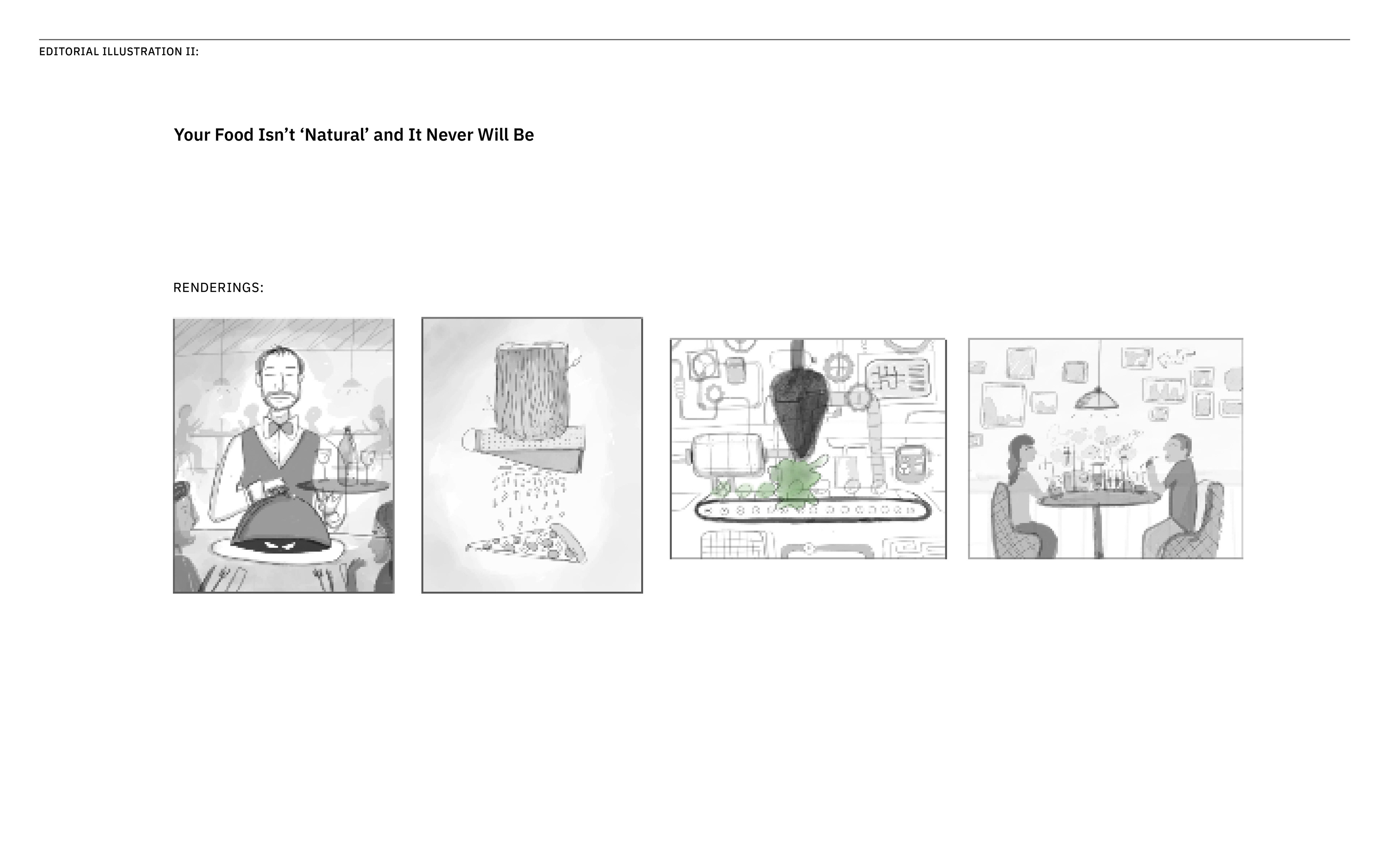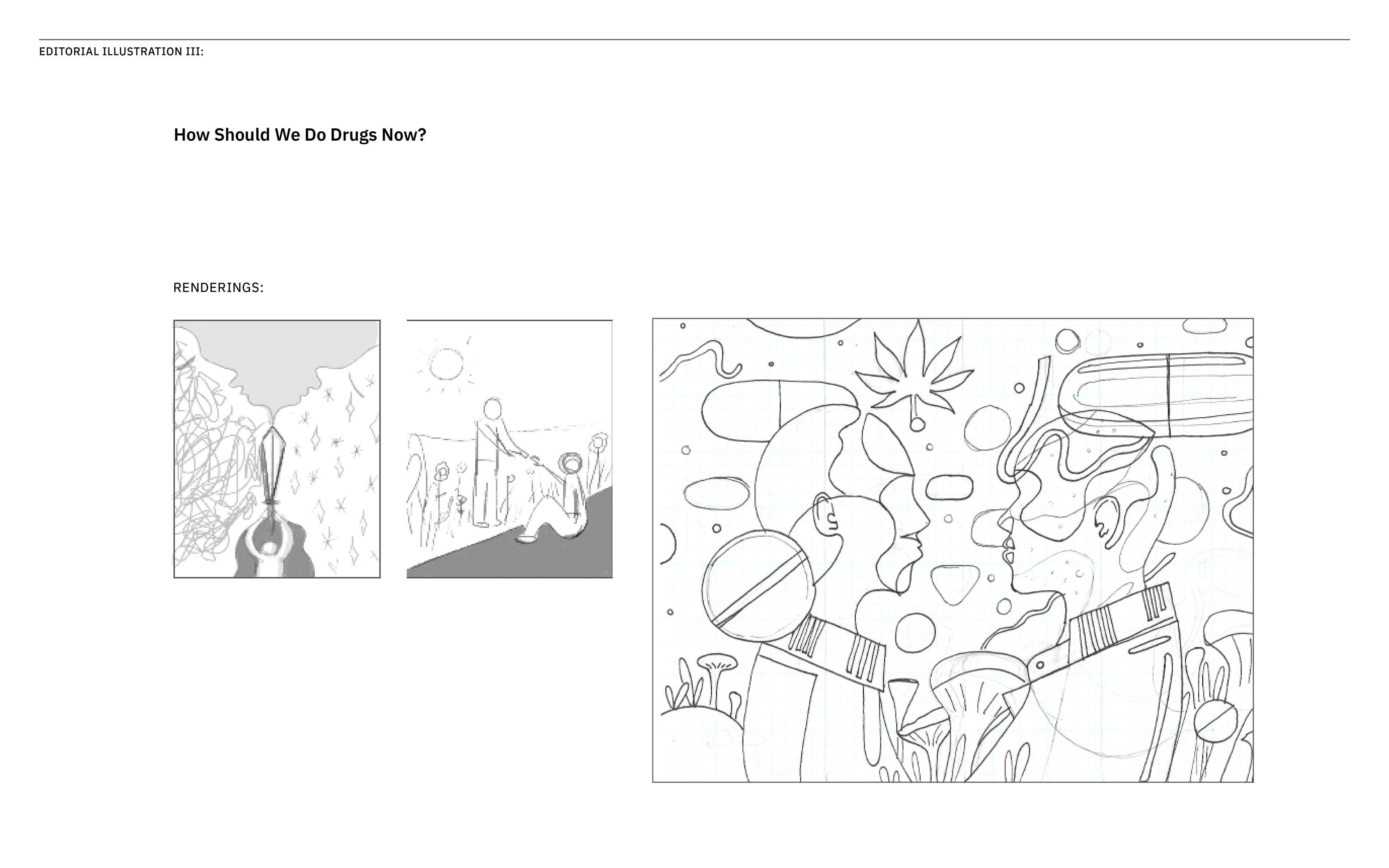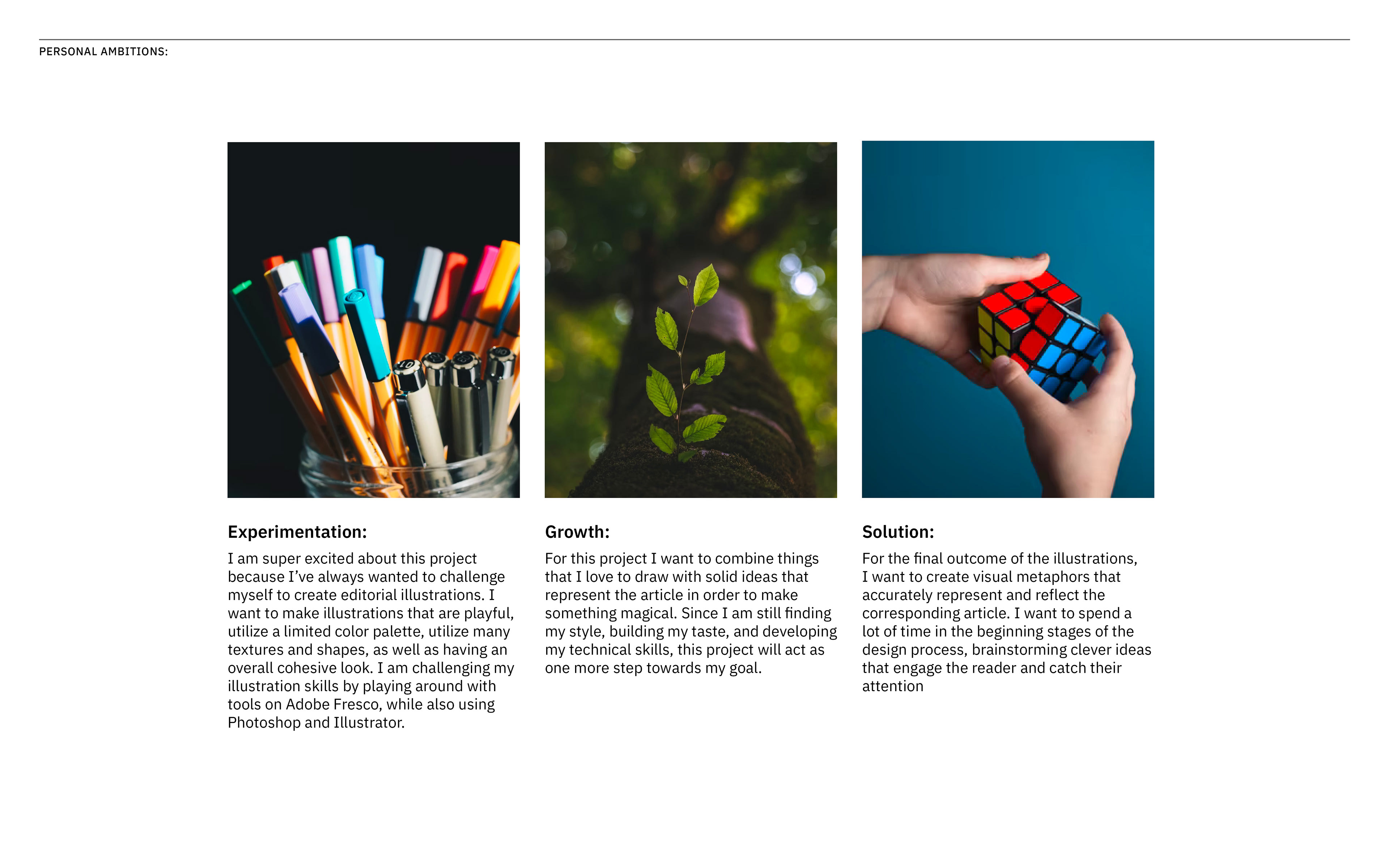 Three digital illustrations reflecting the content of three different kinds of articles.